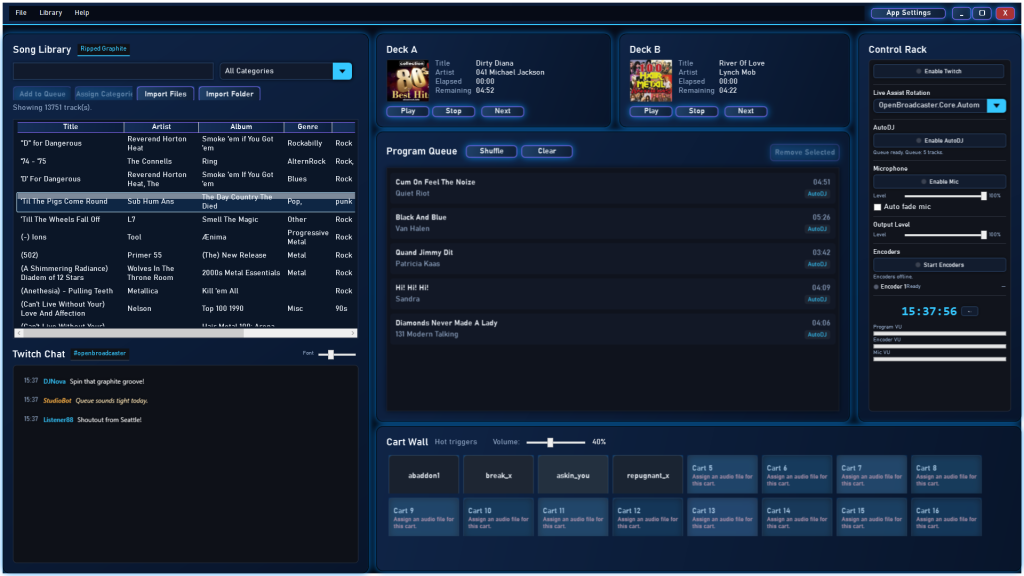 OpenBroadcaster is a full-featured radio automation and broadcasting application designed for internet broadcasters, podcasters, DJs, and live streamers of all sizes. Built with modern technology, it provides professional-grade tools to manage music libraries, schedule playlists, stream live audio, and engage your audience β all from one intuitive interface.